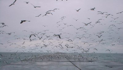 さて、いつもの場所に向かいます。いつもは多くの人が釣っている途中には人が全然いません。やはり朝方は波が高かったようです。堤防上はかわりにウミネコの大群です。その中を突き切って進みます。いつもの場所に到着してみると、釣り人は6人だけです。MTさんもいます。