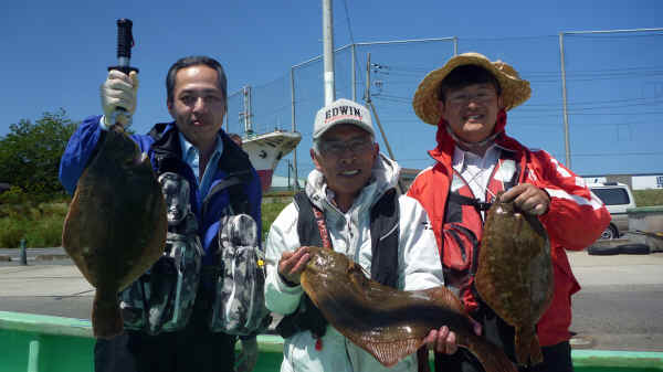 最後に、三人で記念撮影をしました。ノビタさんのカレイが大きすぎですね。きむさんのカレイも良いサイズでした。