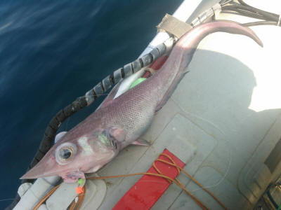到着して準備していると、また写真がきました。これは珍しい、「トウジン」です。深海の外道としては定番ですが、まだ我々は釣ったことがありません。智ちゃんは相当深場狙いのようです。