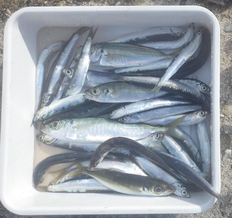 ということで、今日の私の釣果はカタクチイワシ多数、マアジ3匹(餌で一匹消費)、マルアジ2匹、ササノハベラ1匹(リリース)、ショウサイフグ1匹(リリース)でした。写真にはきむさんの釣ったイワシとアジも入っています。